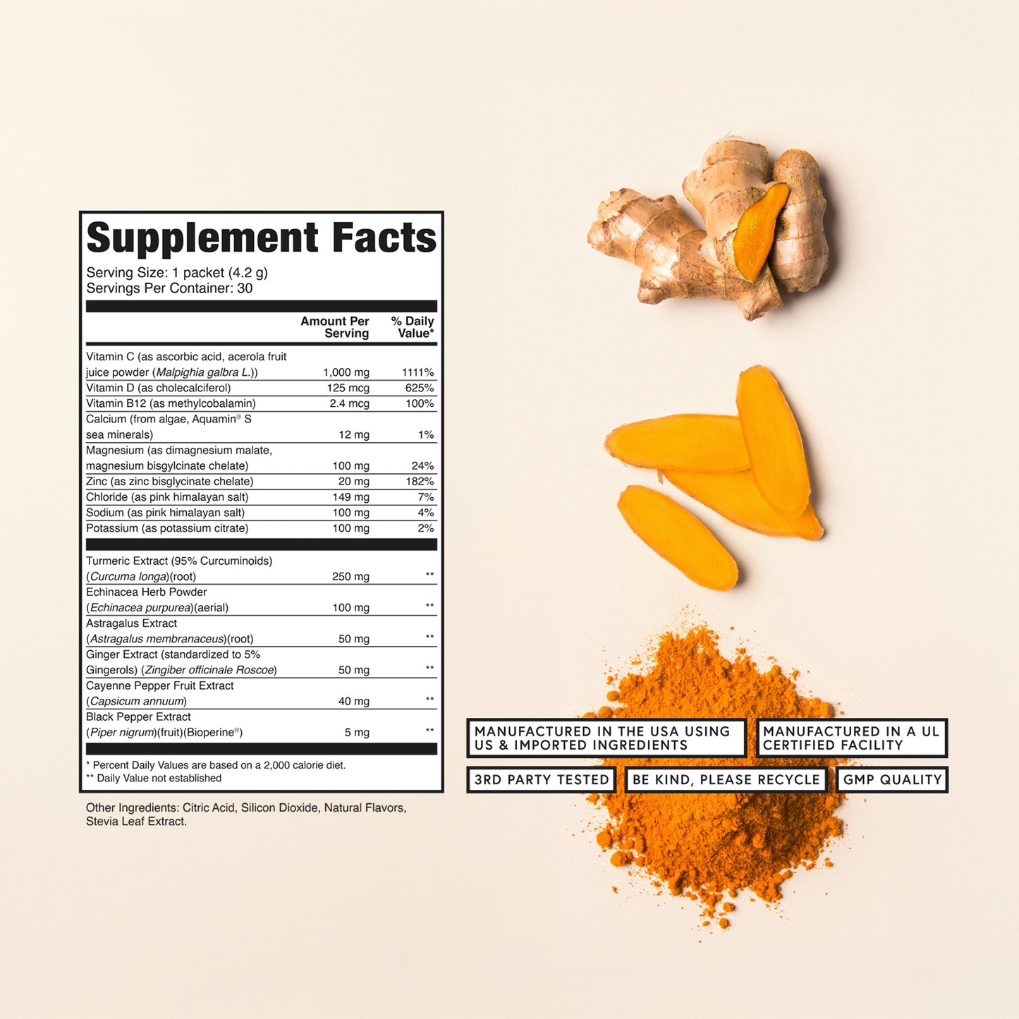 Vitamin C, Vitamin D, Vitamin B12, Calcium (Aquamin®), Magnesium, Zinc, Pink Himalayan Salt, Potassium, Turmeric Extract, Echinacea Extract, Astragalus Extract, Ginger Extract, Cayenne Pepper Fruit Extract, Black Pepper Extract (Bioperine®).